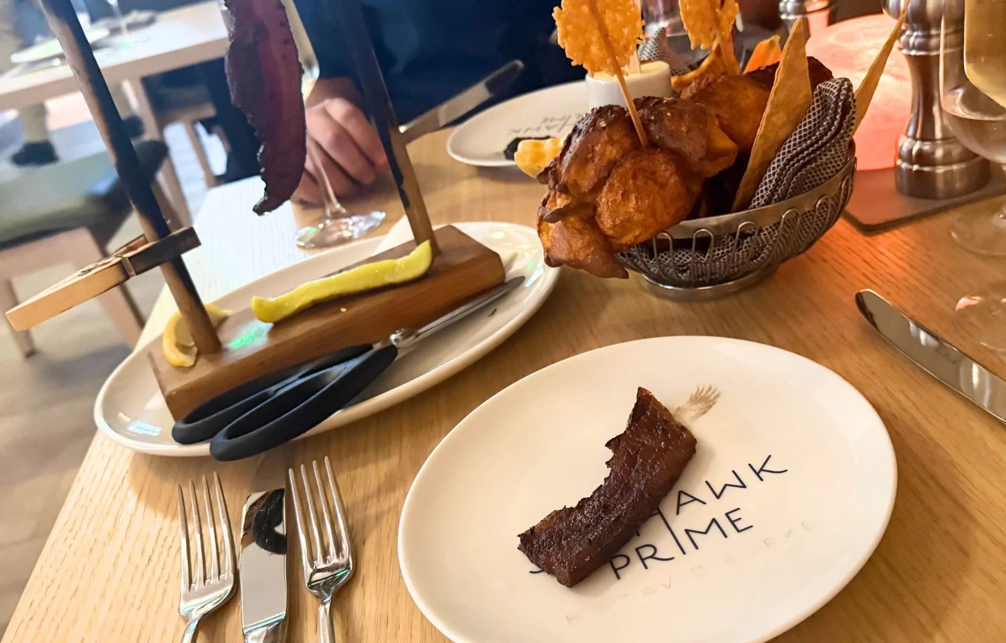 The clothesline bacon arrives like a performance: hick-cut, lacquered, suspended mid-air in true Burke fashion. It’s indulgent, theatrical, and unmistakably signature.